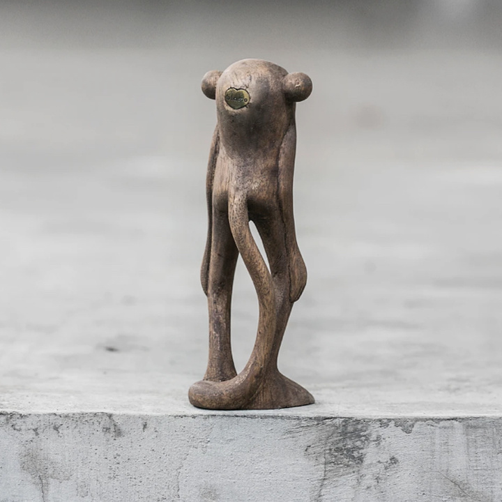 Minky is hand carved from monkeypod wood and stands approximately 7.5" tall. He comes in a hand-made box.