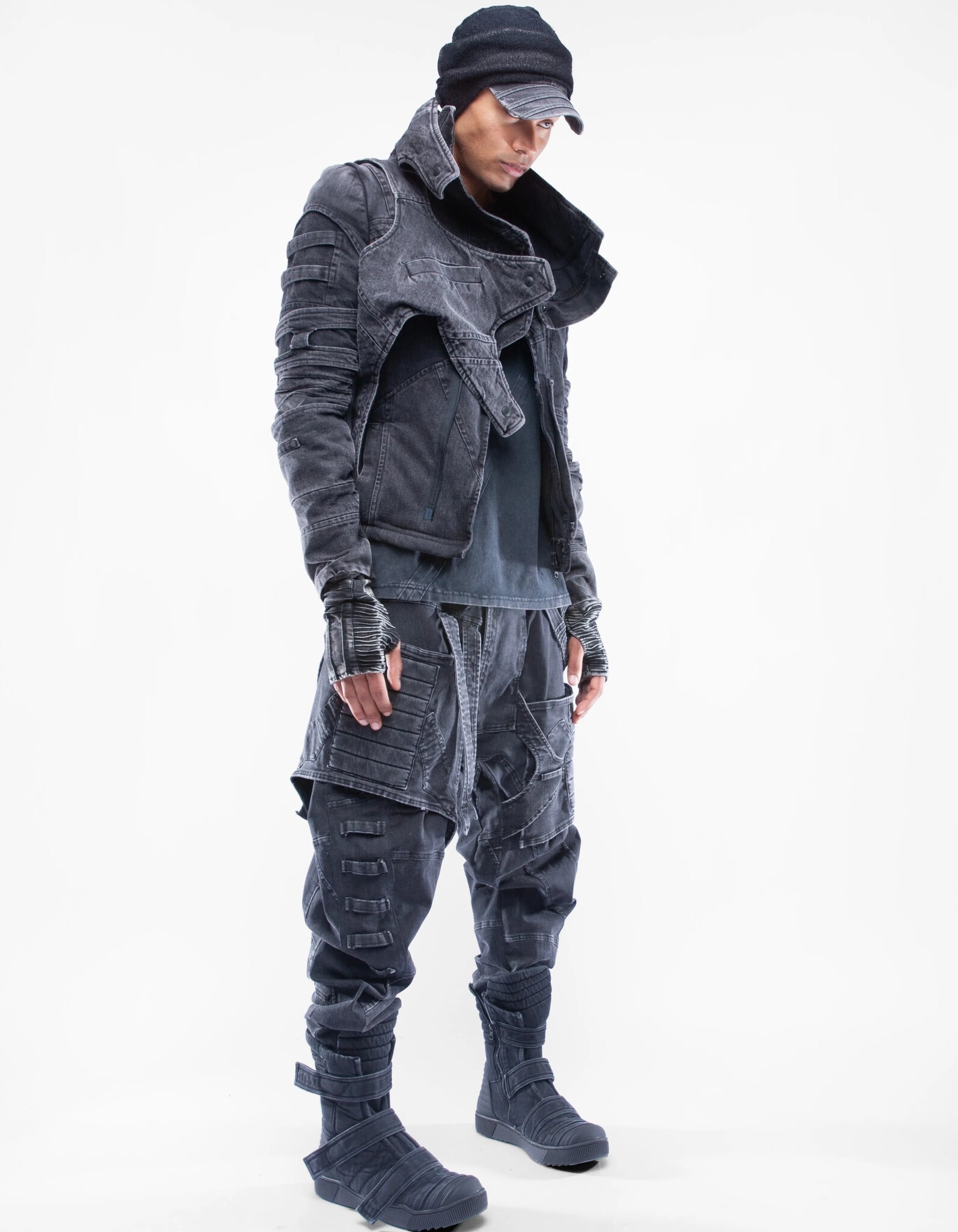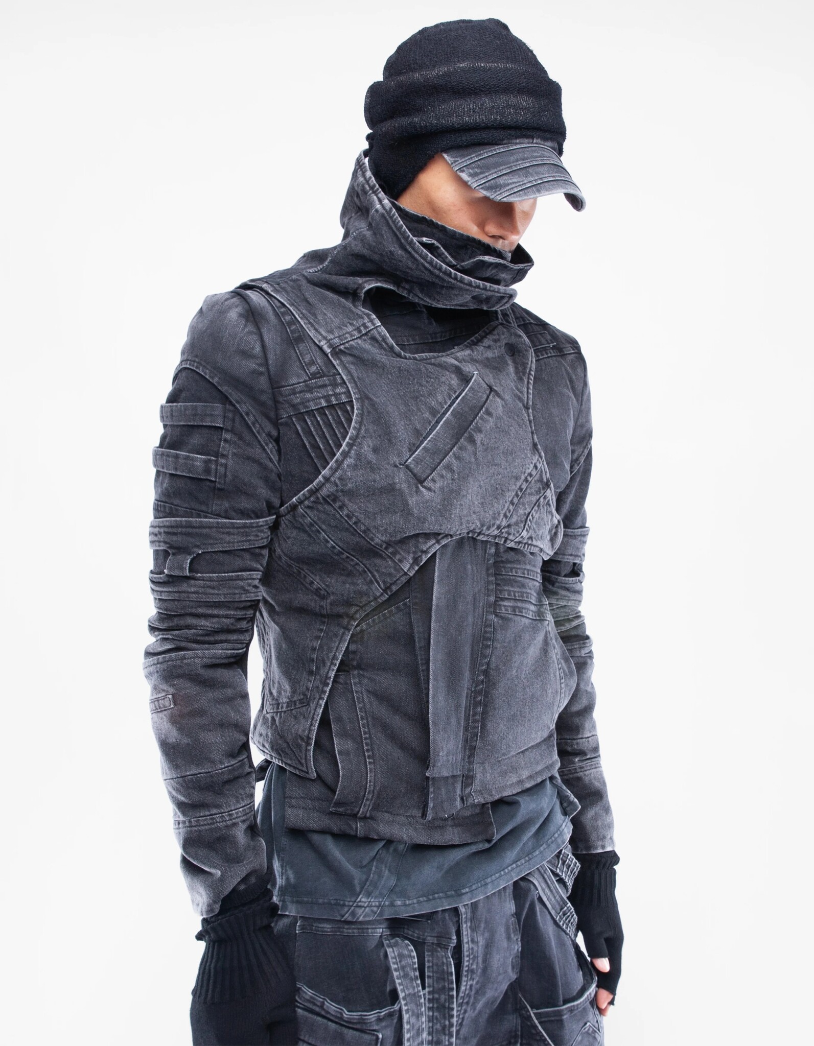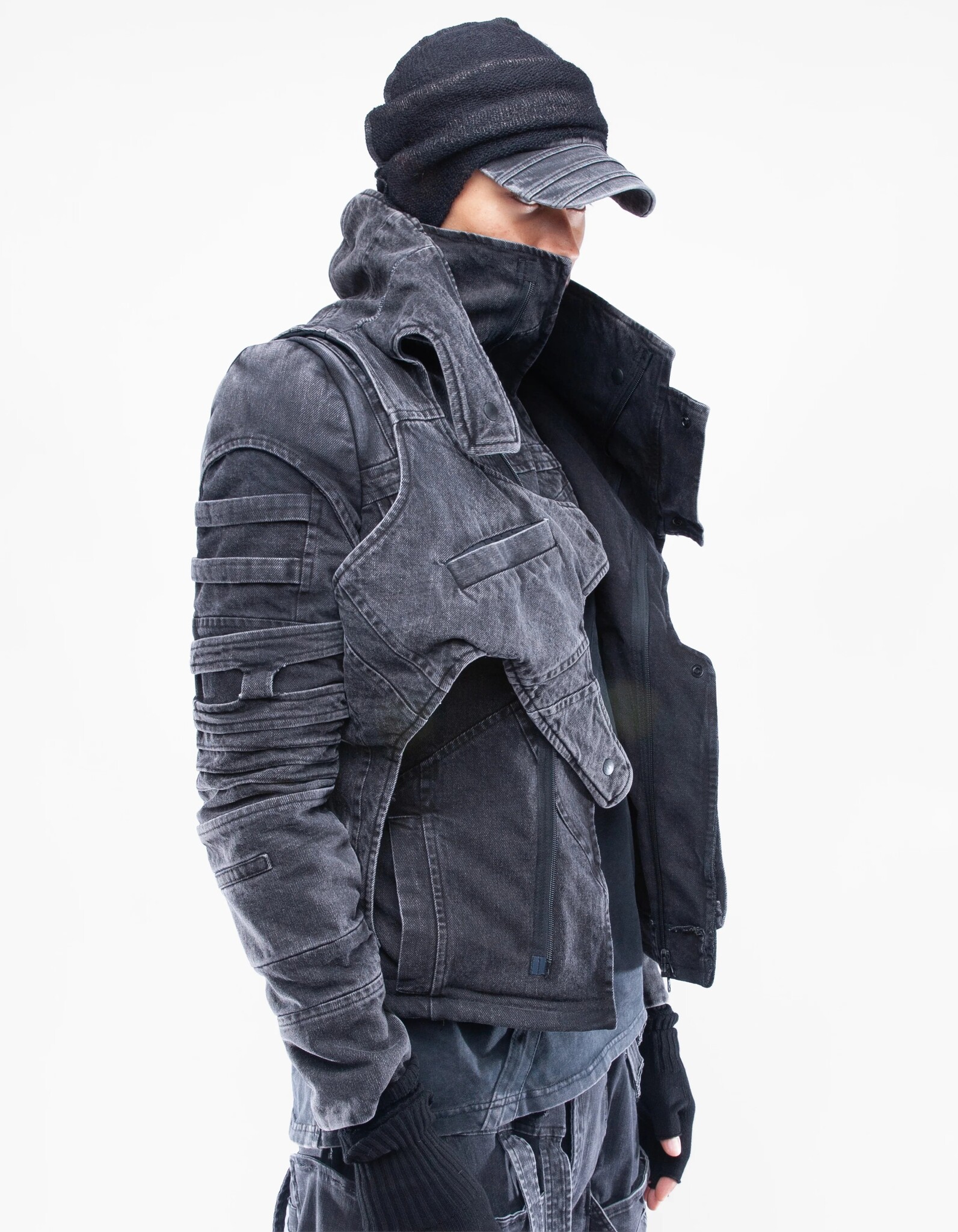asymmetric high-collar fitted denim jacket
