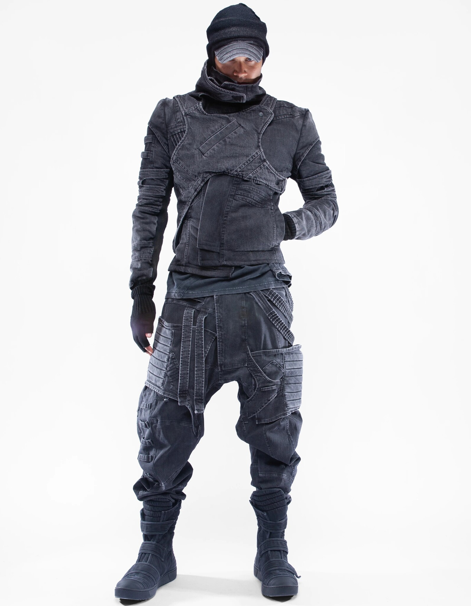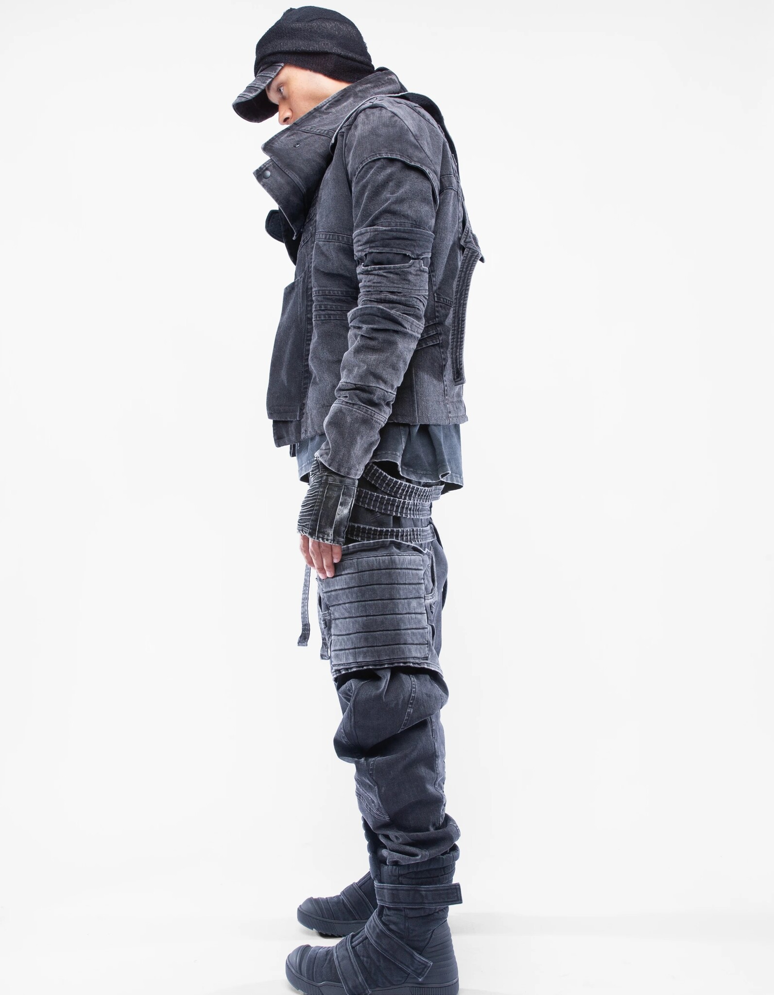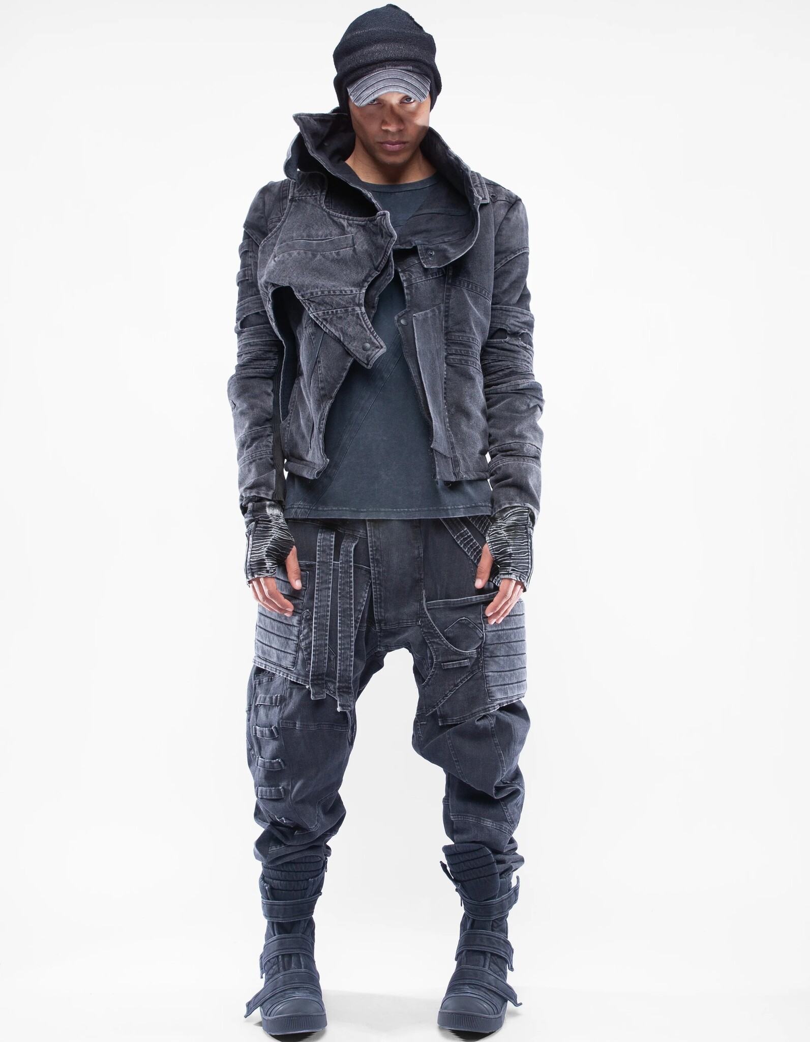 asymmetric high-collar fitted denim jacket