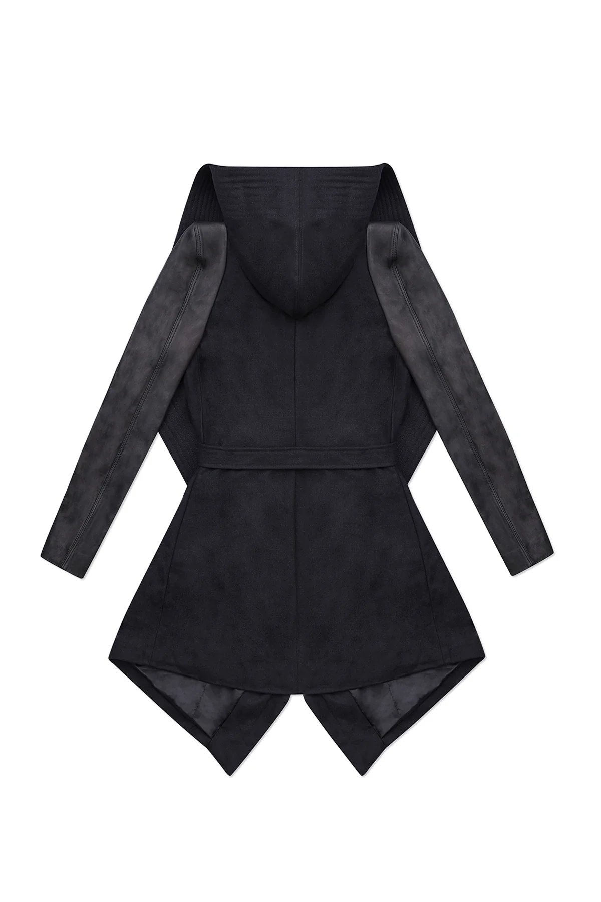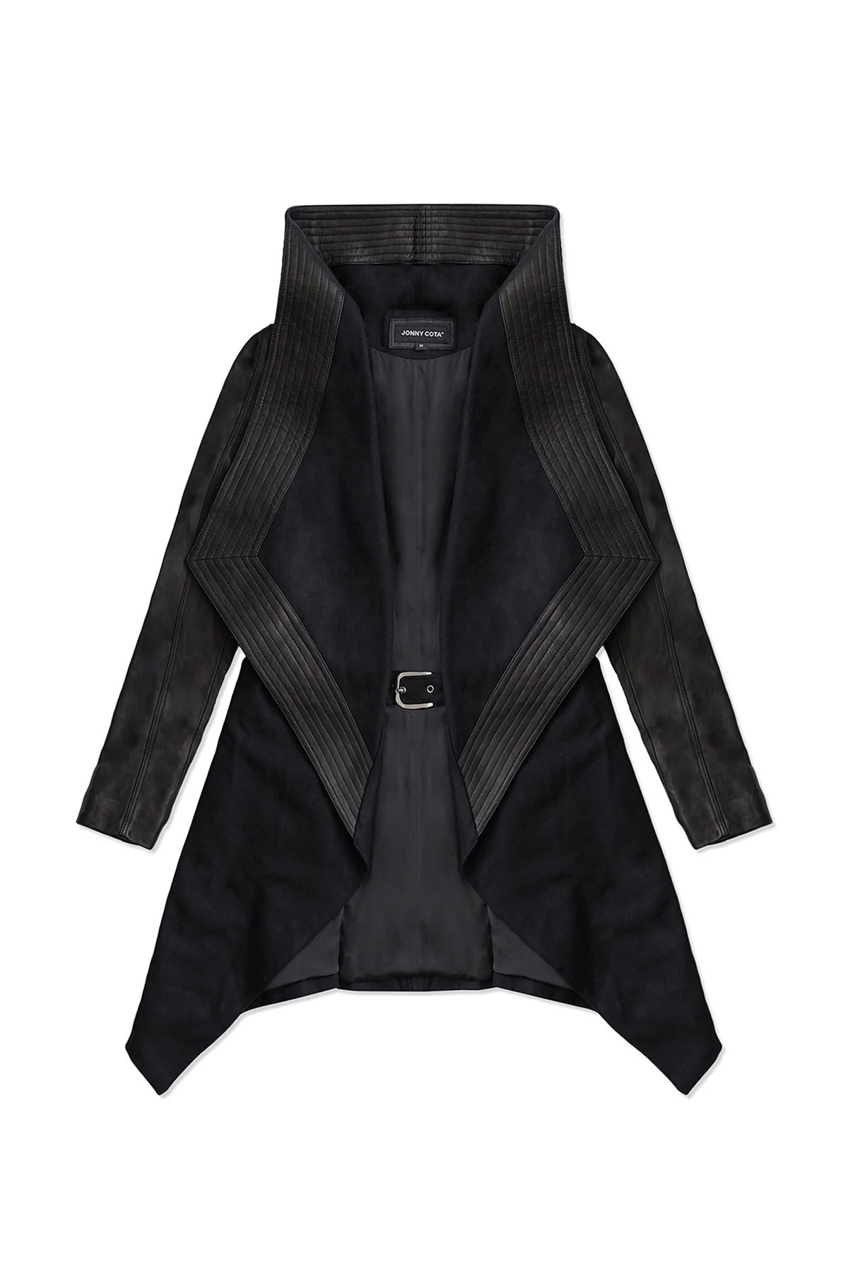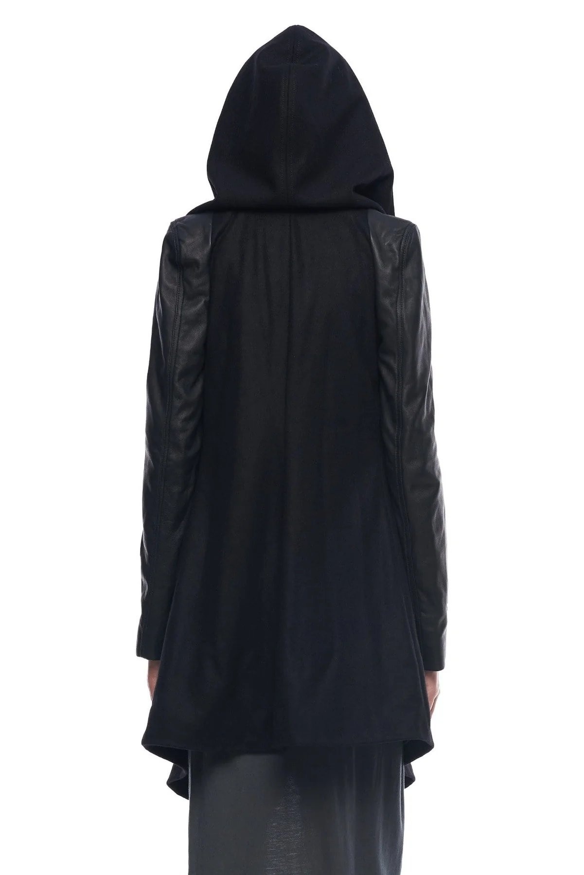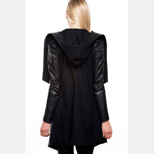 Create an accountOur best-selling Hooded Wool Coat features a dramatic draped wool hood with leather trim, fitted leather sleeves, and a built-in buckle waist belt closure.
