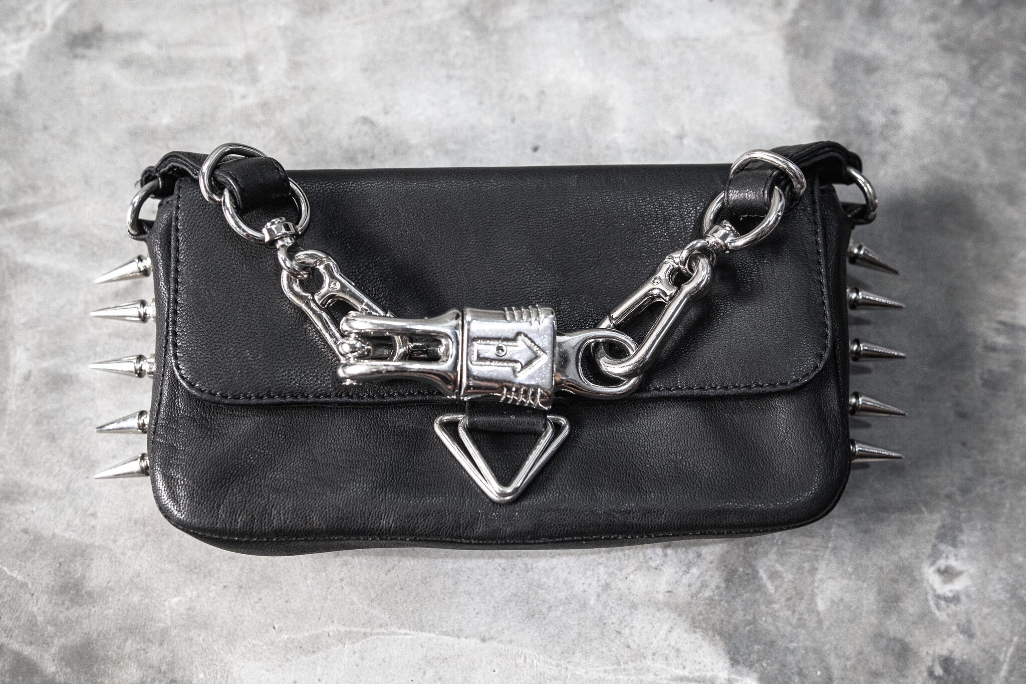 Make a daring statement with this bag, designed for those who love edgy, industrial aesthetics. This bold piece features a sleek black leather body with striking silver metal spikes along the sides, perfect for adding a rebellious twist to your outfit.