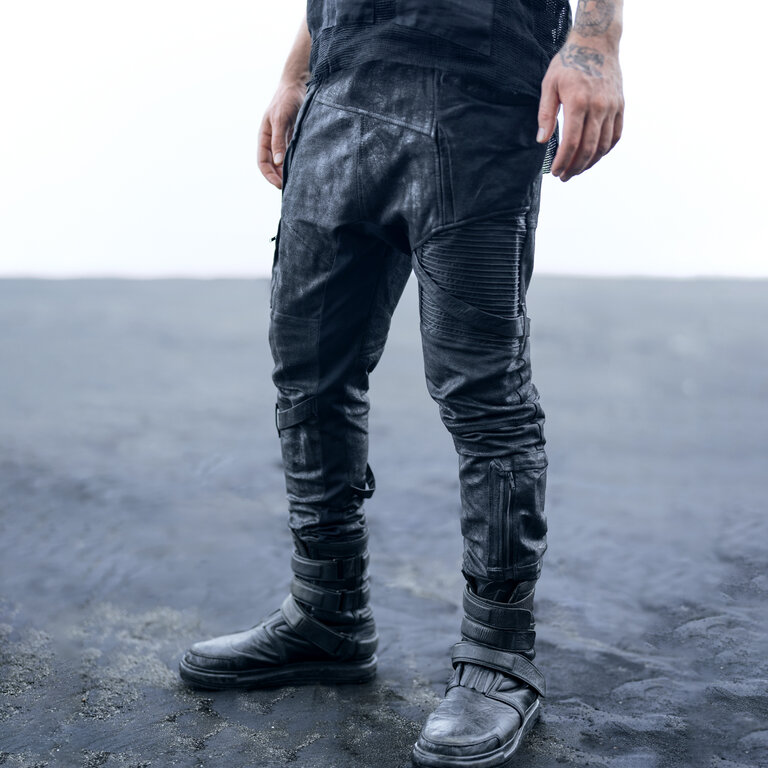 Create an accountCoated tactical joggers or cargo pants with 6 multi utility pockets and distressed grunge texture. Regular fit, mid-rise. Full length with drop crotch. Elastic waistband. Spacious hip area with tight silhouette from below the knee.