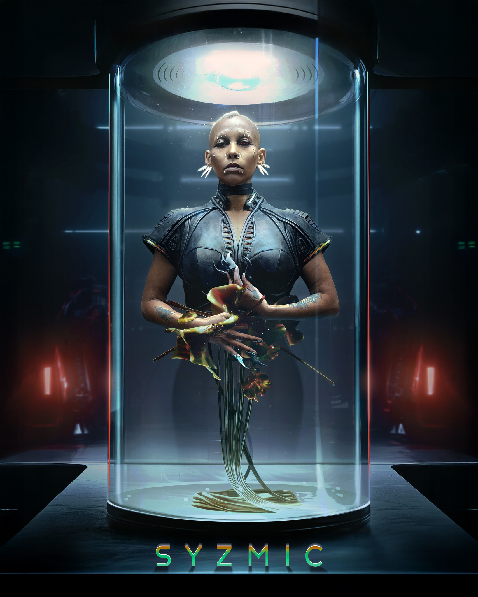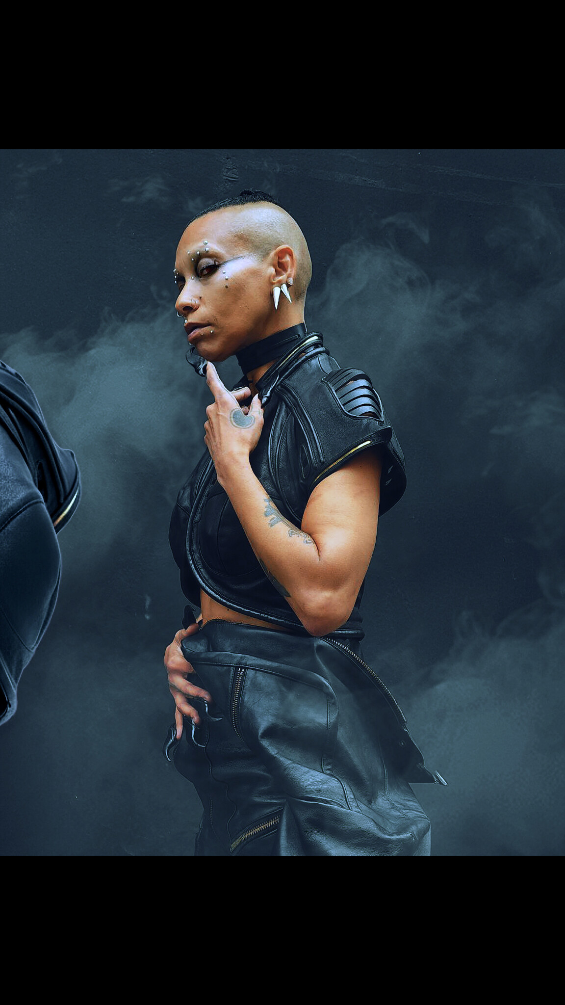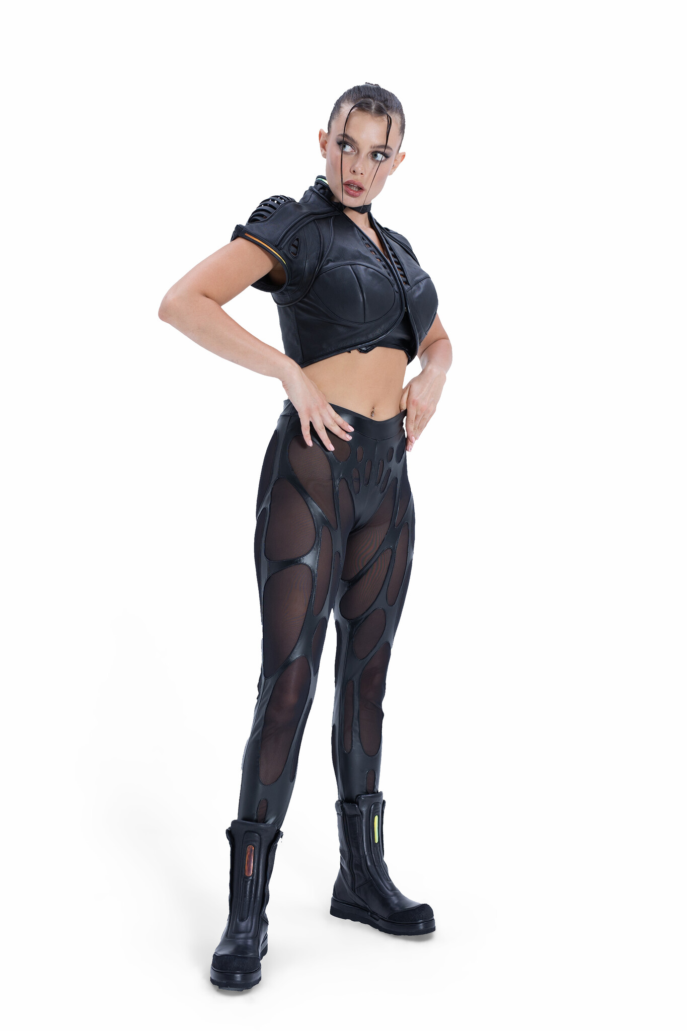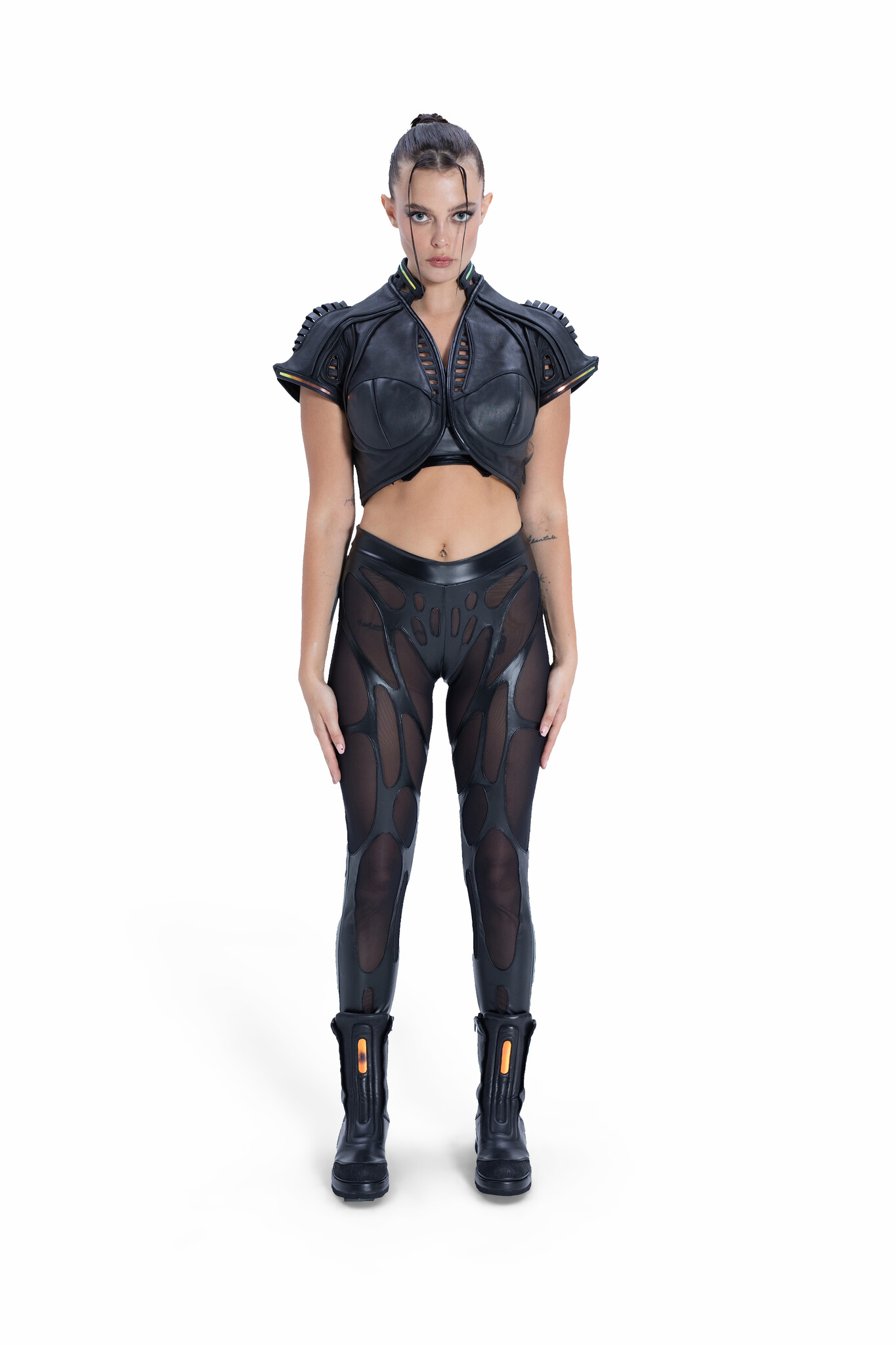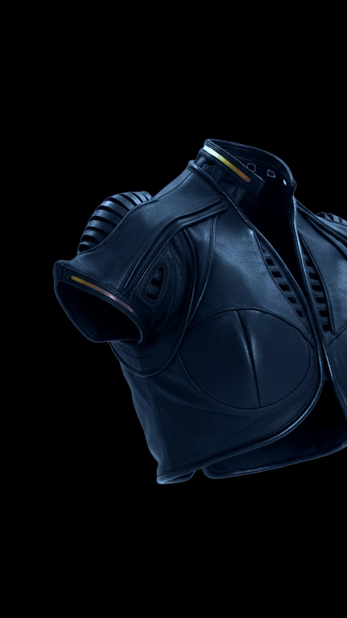 A fusion of futurism and organic cyber-tech aesthetics, the EIDOS-414 redefines avant-garde outerwear. Sharp architectural lines merge with fluid biomorphic shapes, anchored by an aggressive exo-skeletal shoulder frame and holographic futurism.